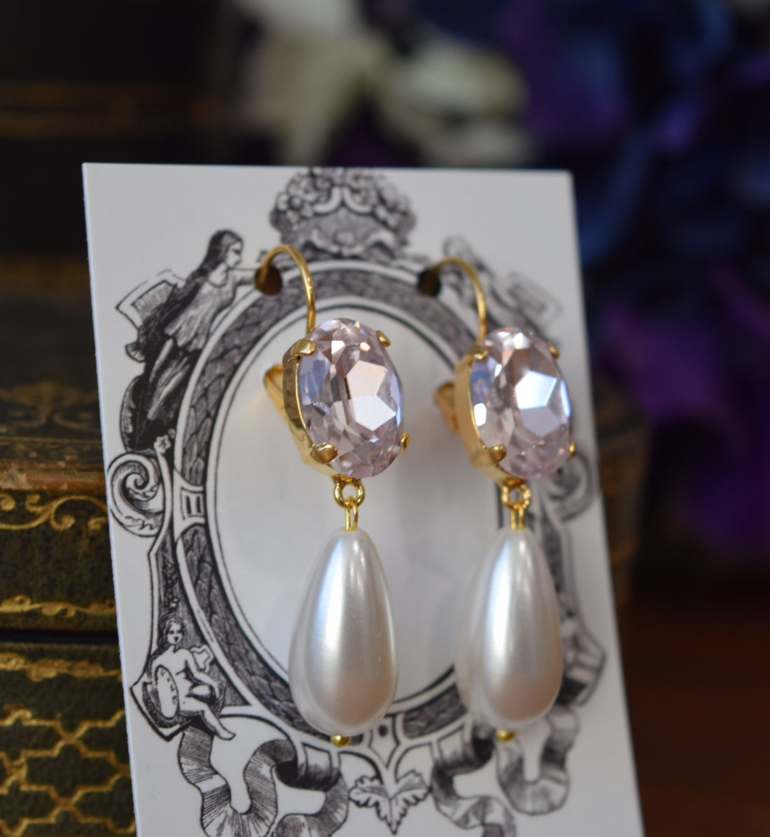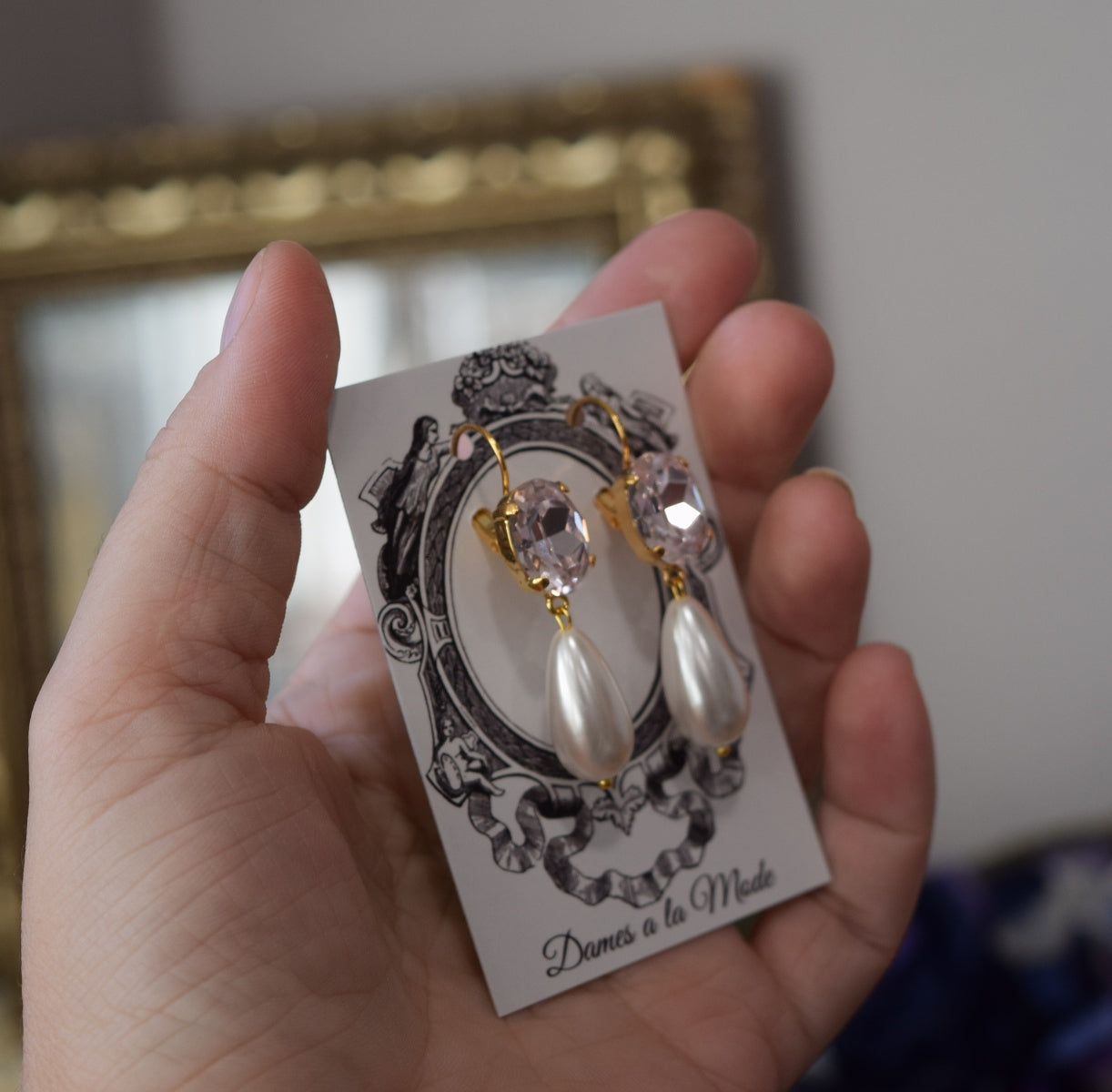 Blush Pink Crystal and Pearl Dangles - Medium Oval Stones, Large Pearls
