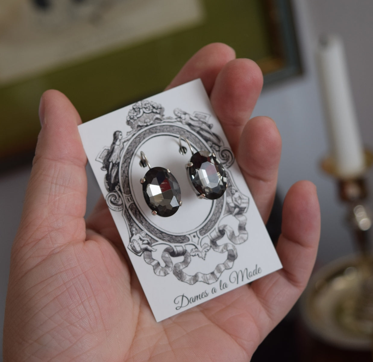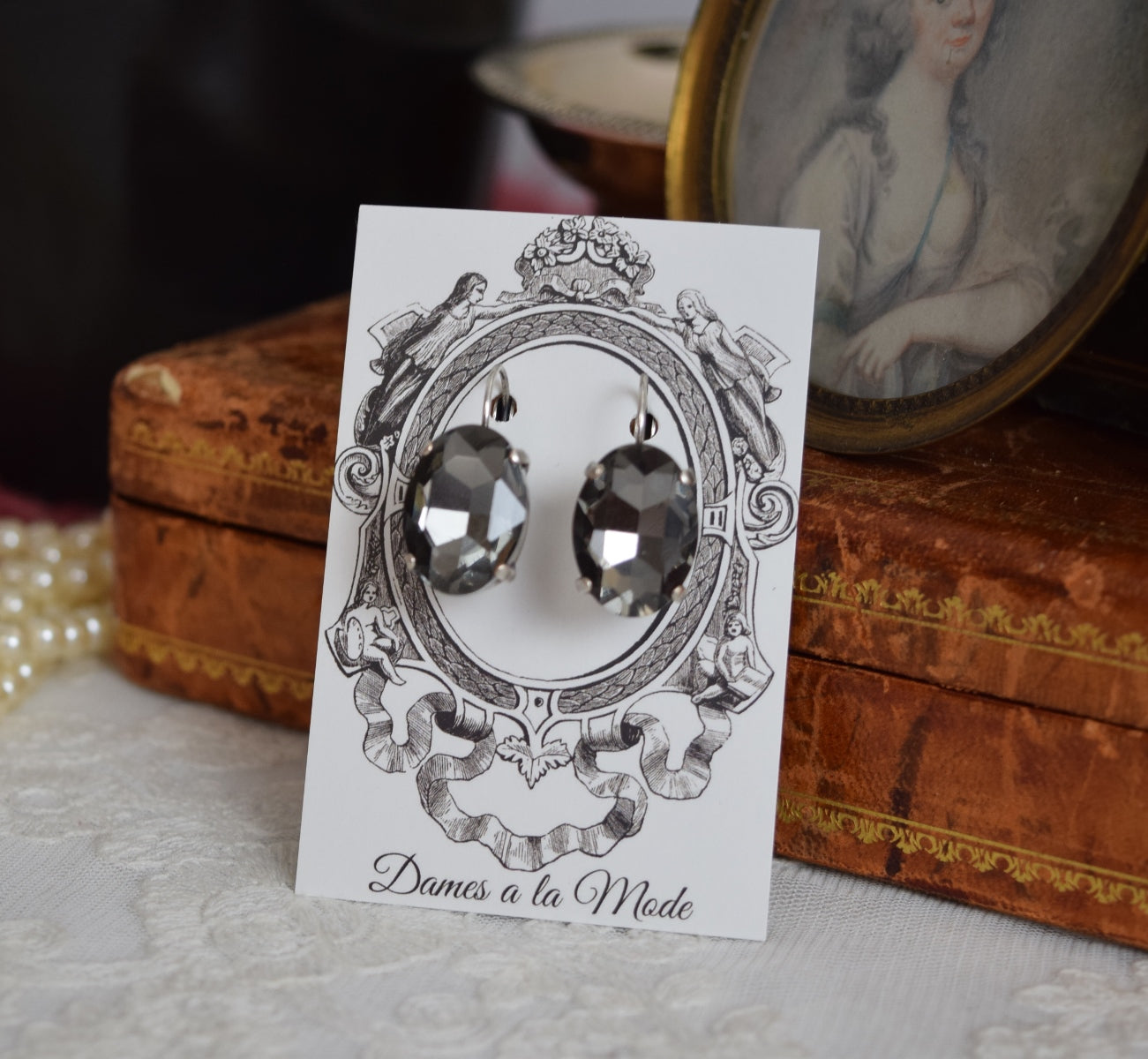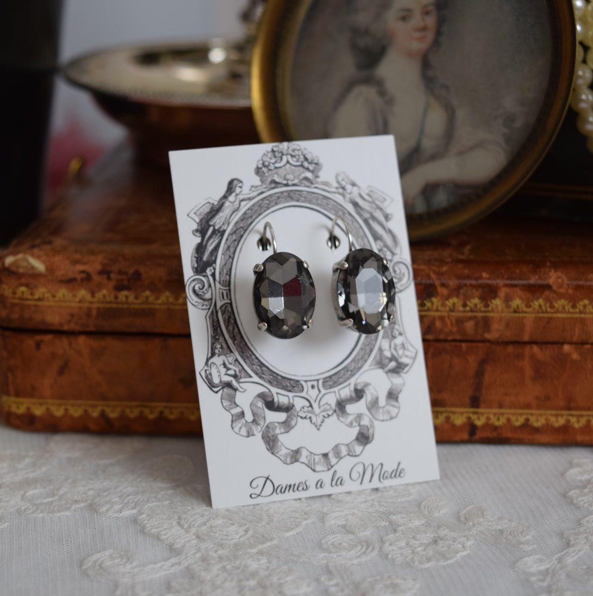SALE! Grey Crystal Earrings - Large Oval