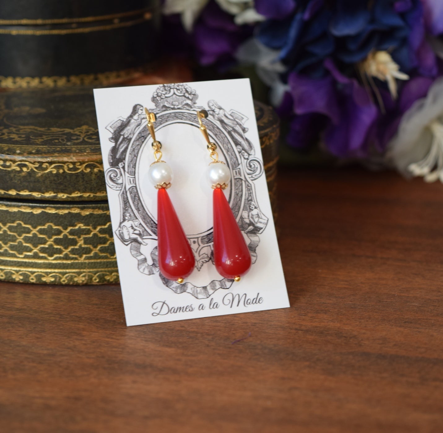 BLACK FRIDAY Red Coral and Pearl Teardrop Earrings