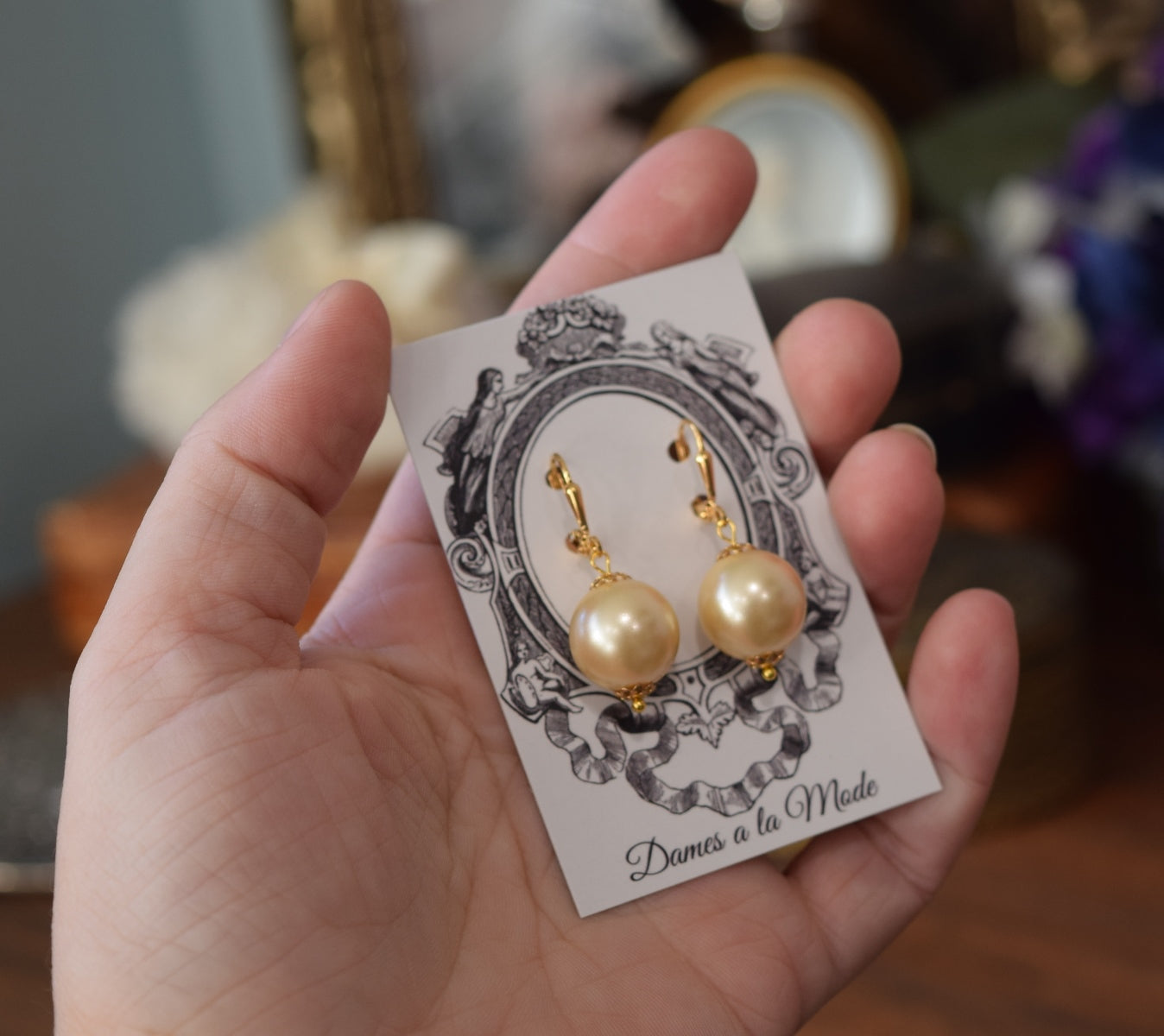 These cute a versatile earrings are made with a lovely creamy colored glass pearl and finished with gold plated filigree caps.