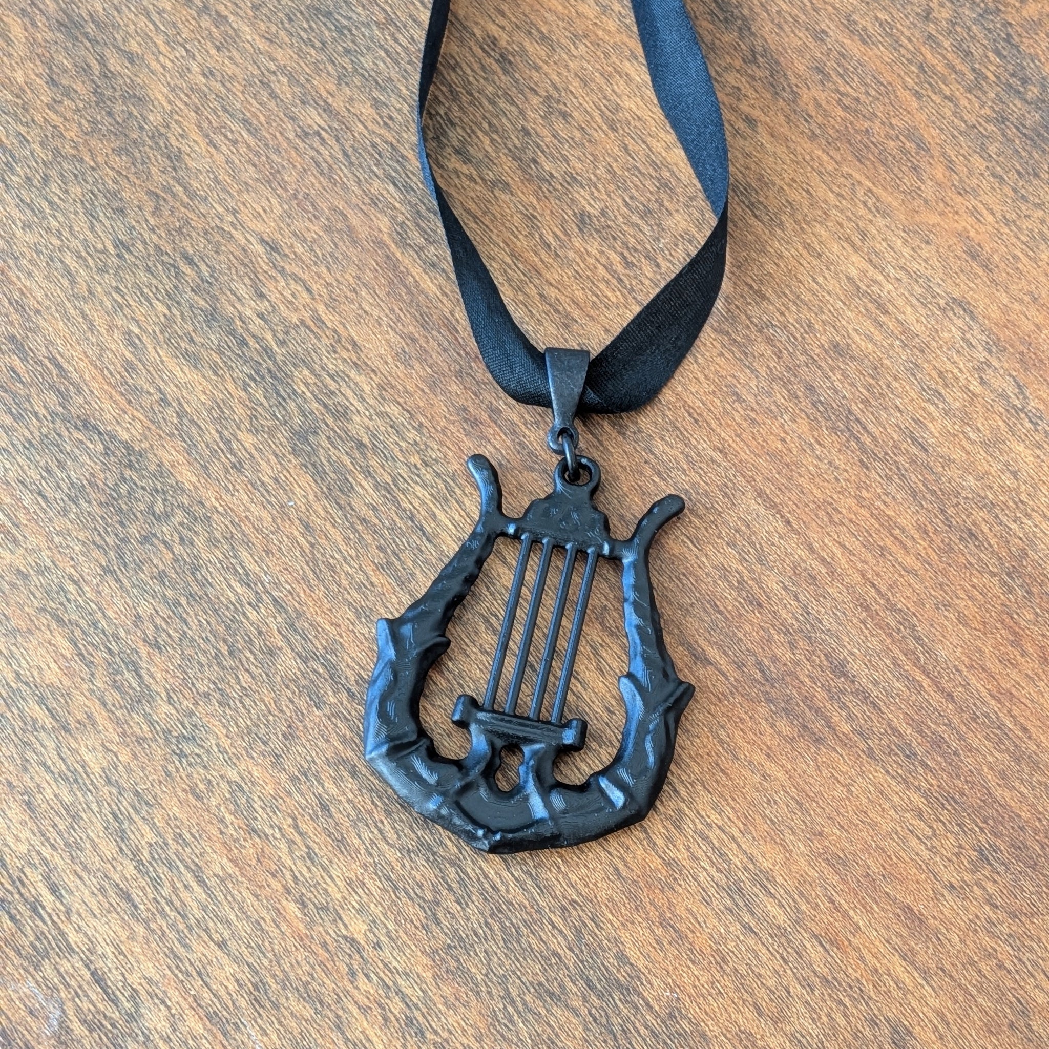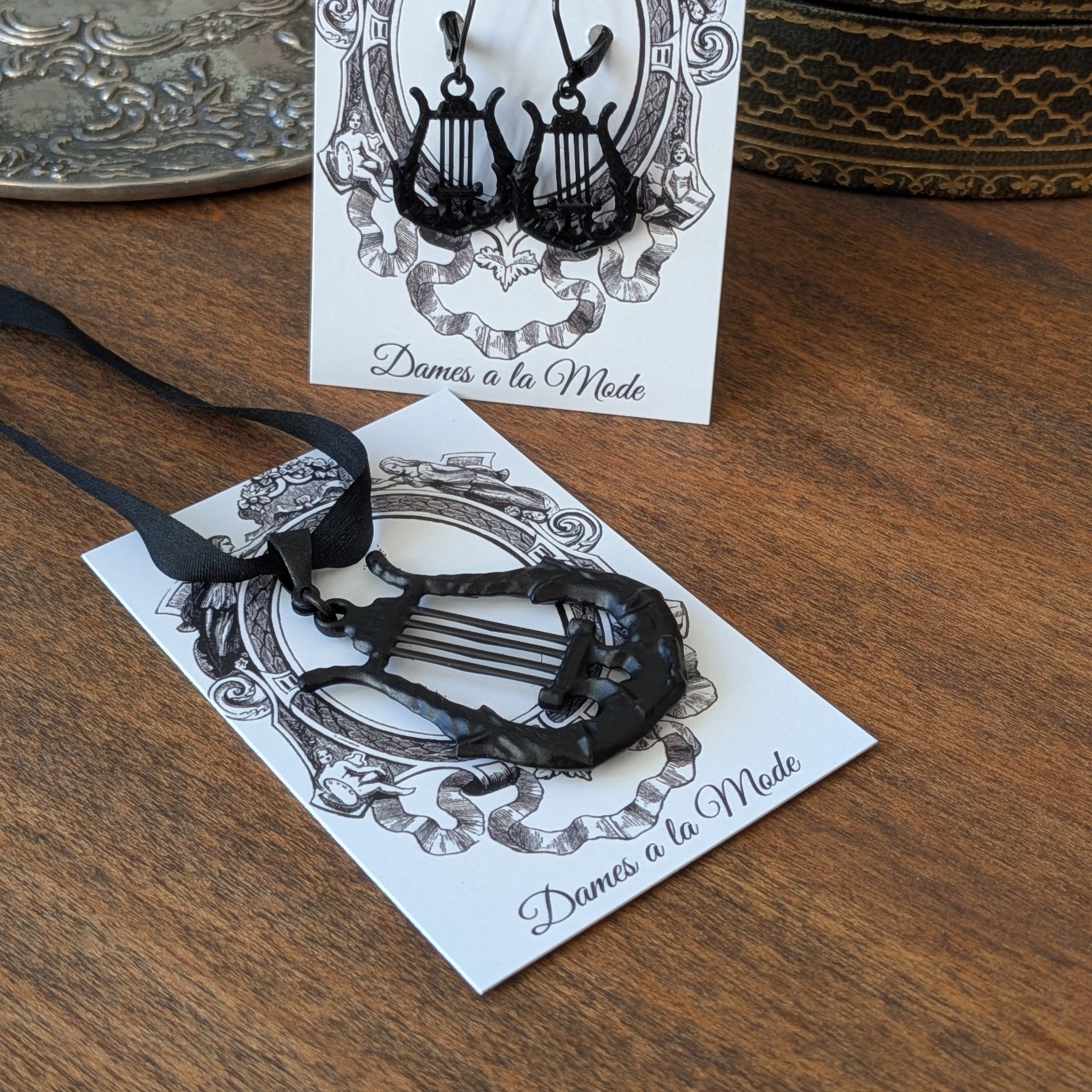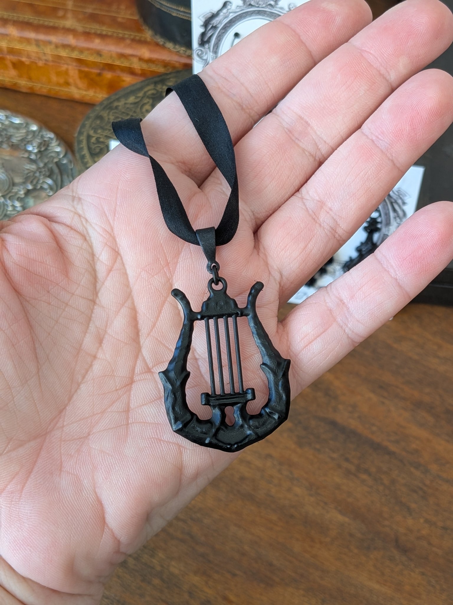 Large lyre pendant! This style is based off of an original watch fob. Includes 1 yard of 1/4" black silk ribbon to be worn tied closed.
