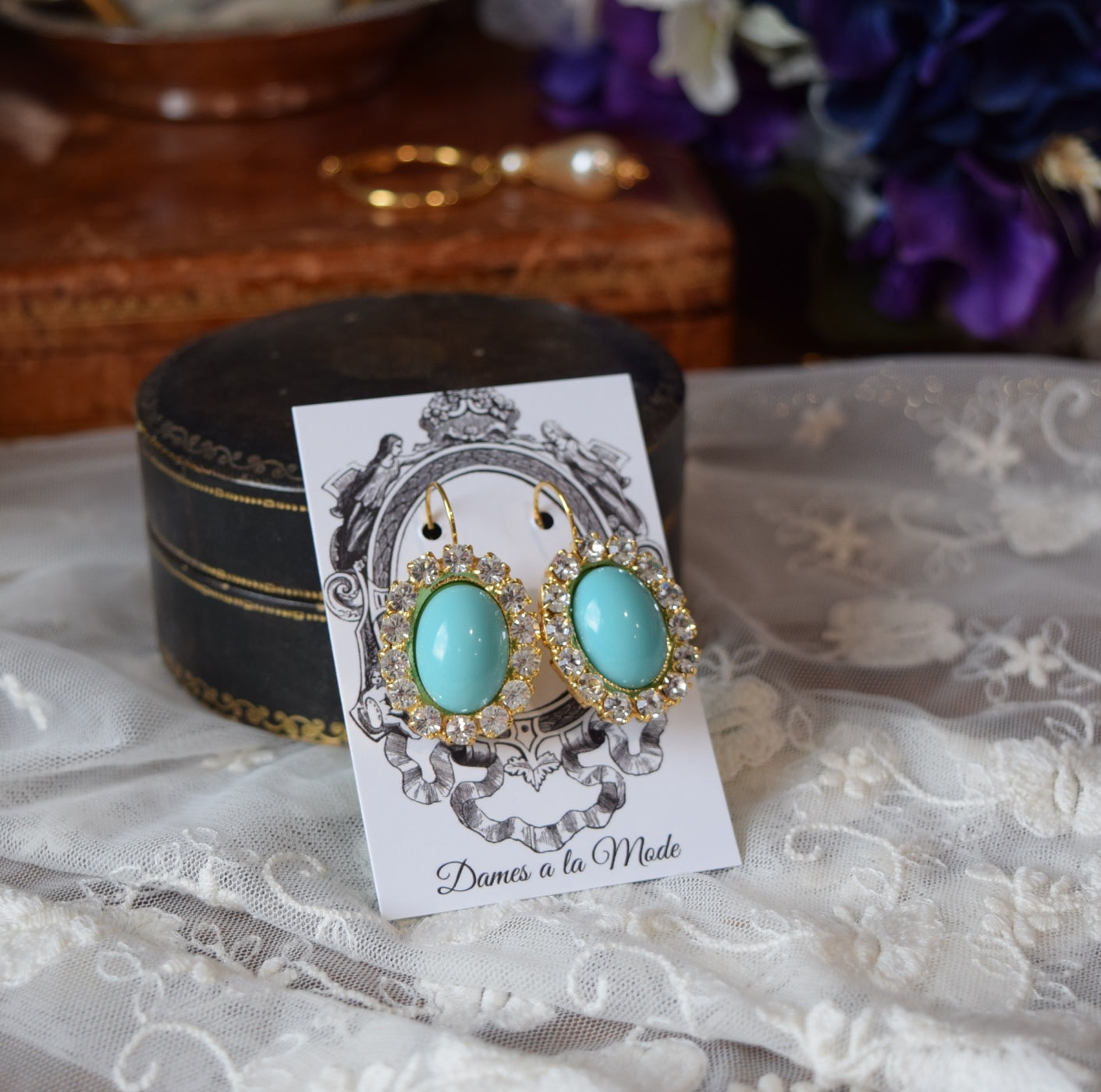 These lovely light blue glass turquoise colored stones look wonderful and luxurious surrounded by a halo of Swarovski crystals!