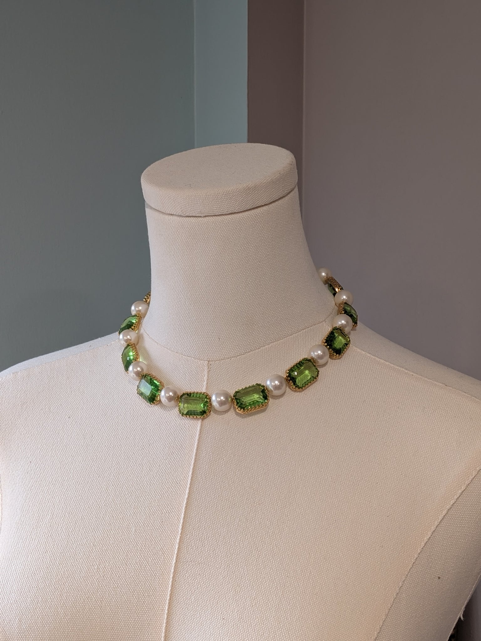 This necklace matches these earrings: https://www.damesalamode.com/products/peridot-green-swarovski-earrings-large-octagon-crown?_pos=9&_sid=f0e2ef9b5&_ss=r