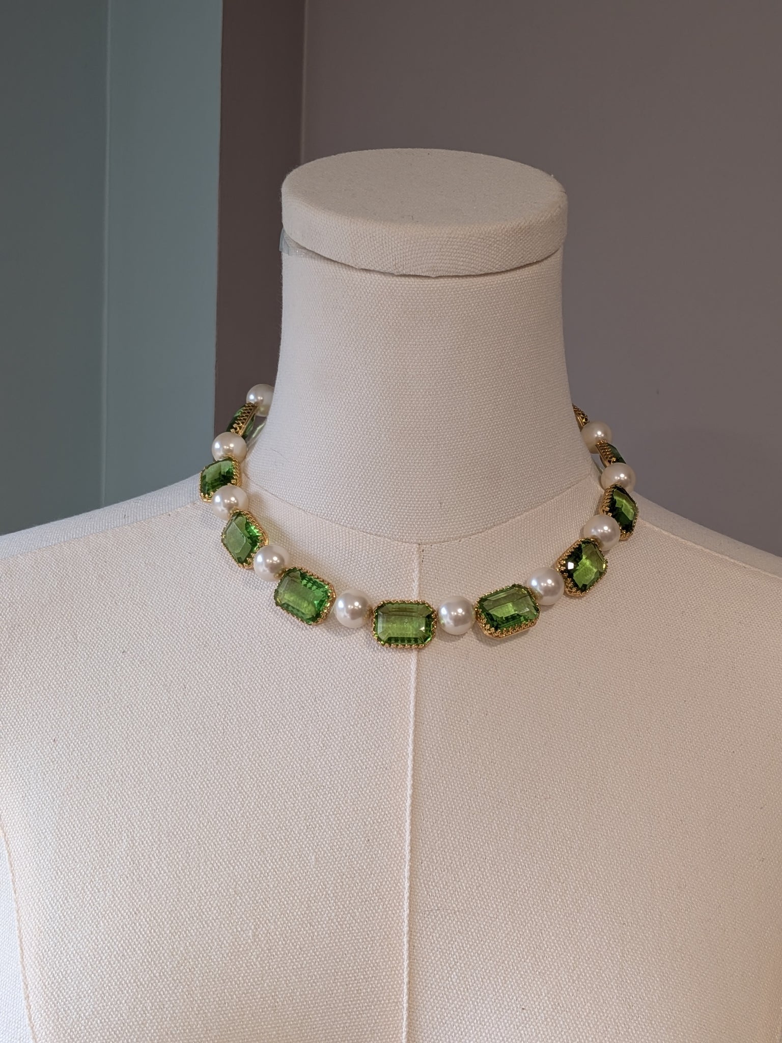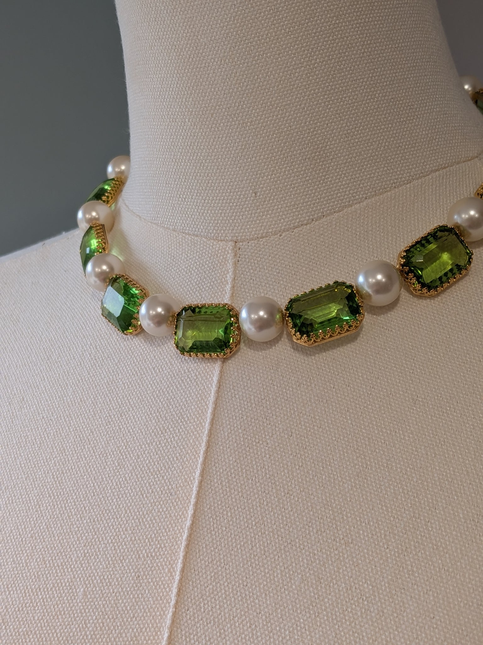 Her necklace of large Peridot stones mixed with big pearls is so striking and unusual! I've used 18x13mm vintage clear Peridot crystals and 12mm glass pearls in a creamy tone.