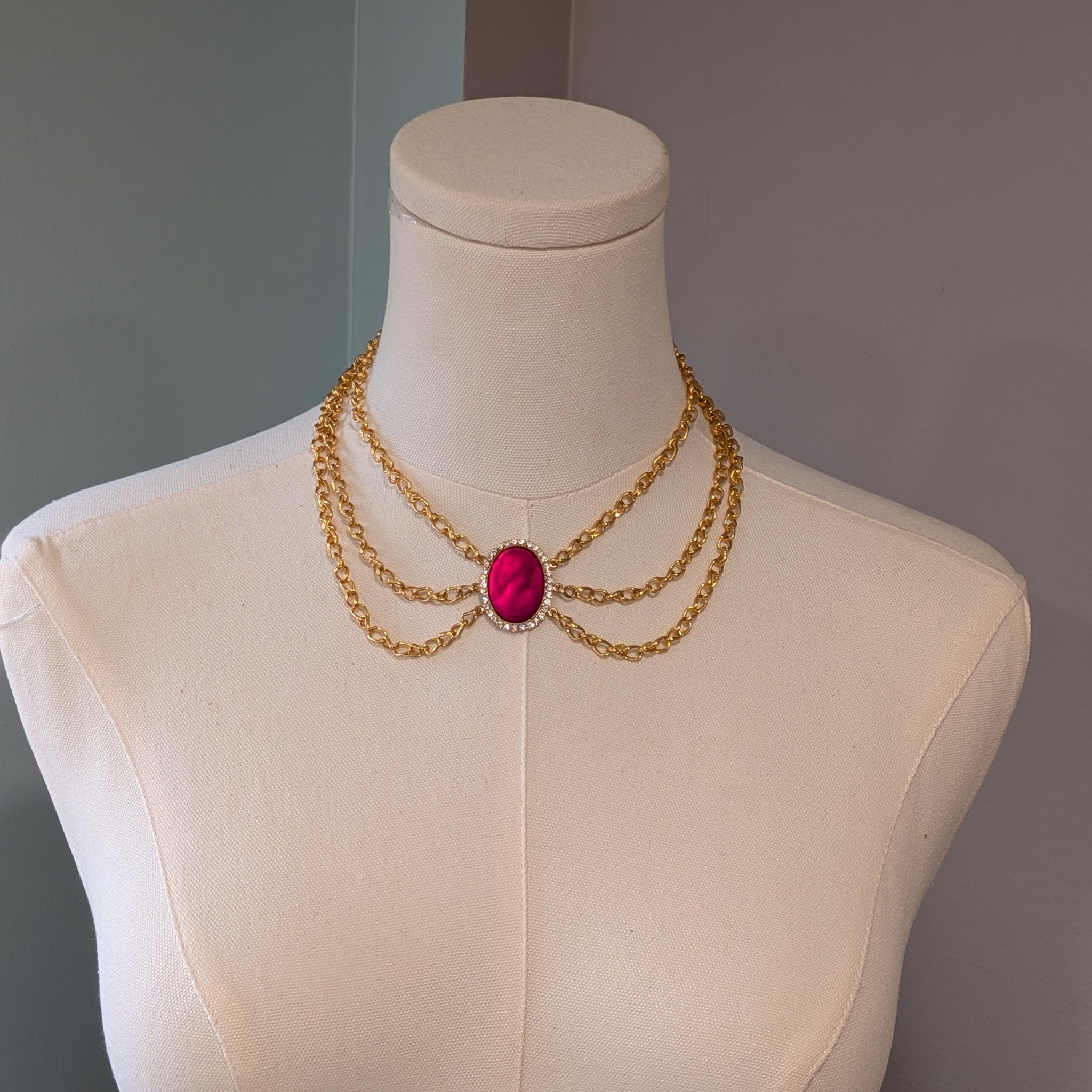 This necklaces features are large central medallion holding a vintage glass cameo in a bright, rich red. It catches the light in a beautiful and eye-catching way.  It is suspended on three tiers of oval chain which forms elegant swags when worn. The chain also flashes and shines for extra oomph.