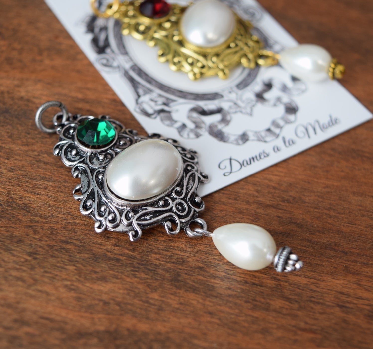 Renaissance pendant with a vintage faux pearl cabochon and a vintage Swarovski crystal in Emerald or Garnet.
