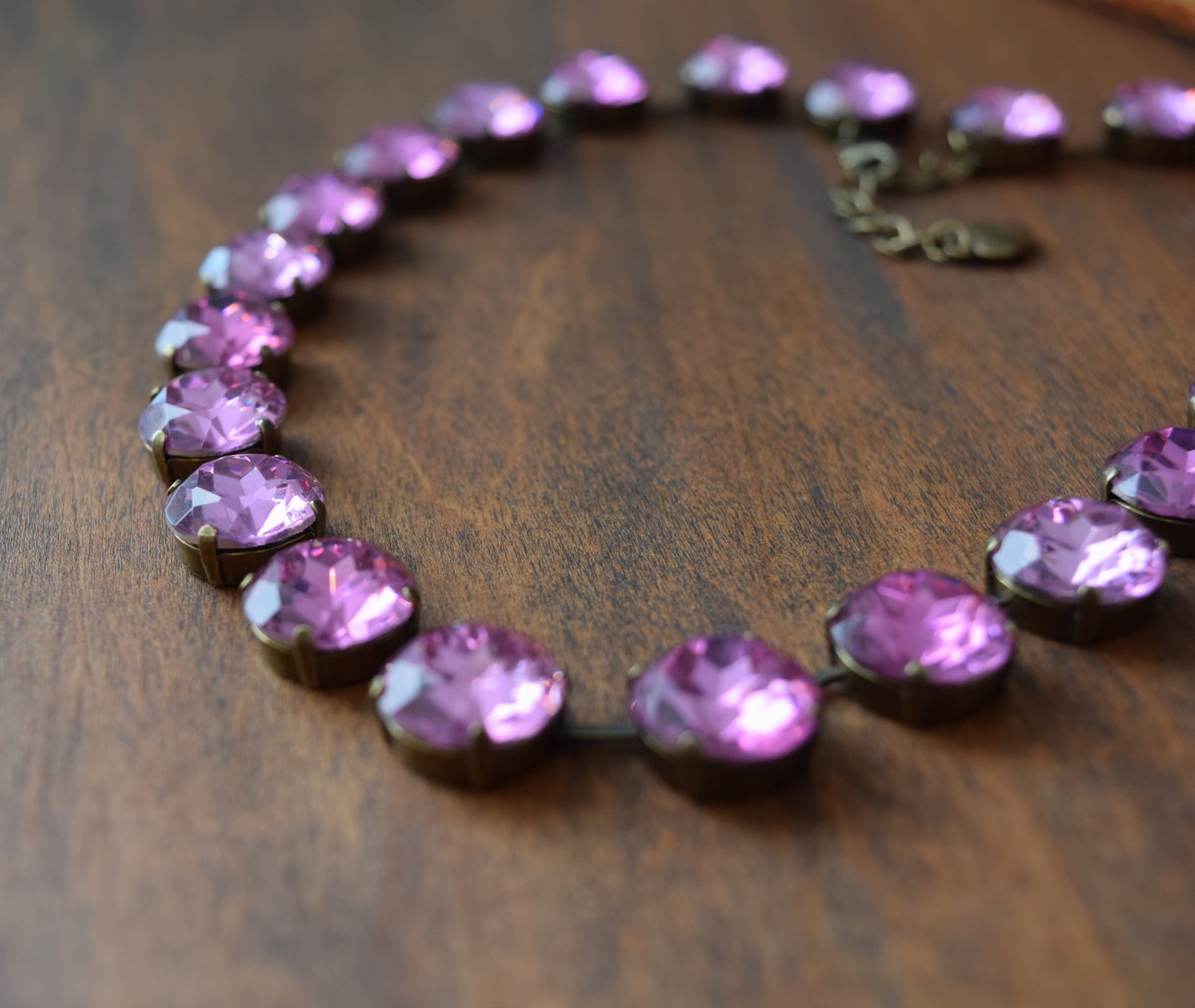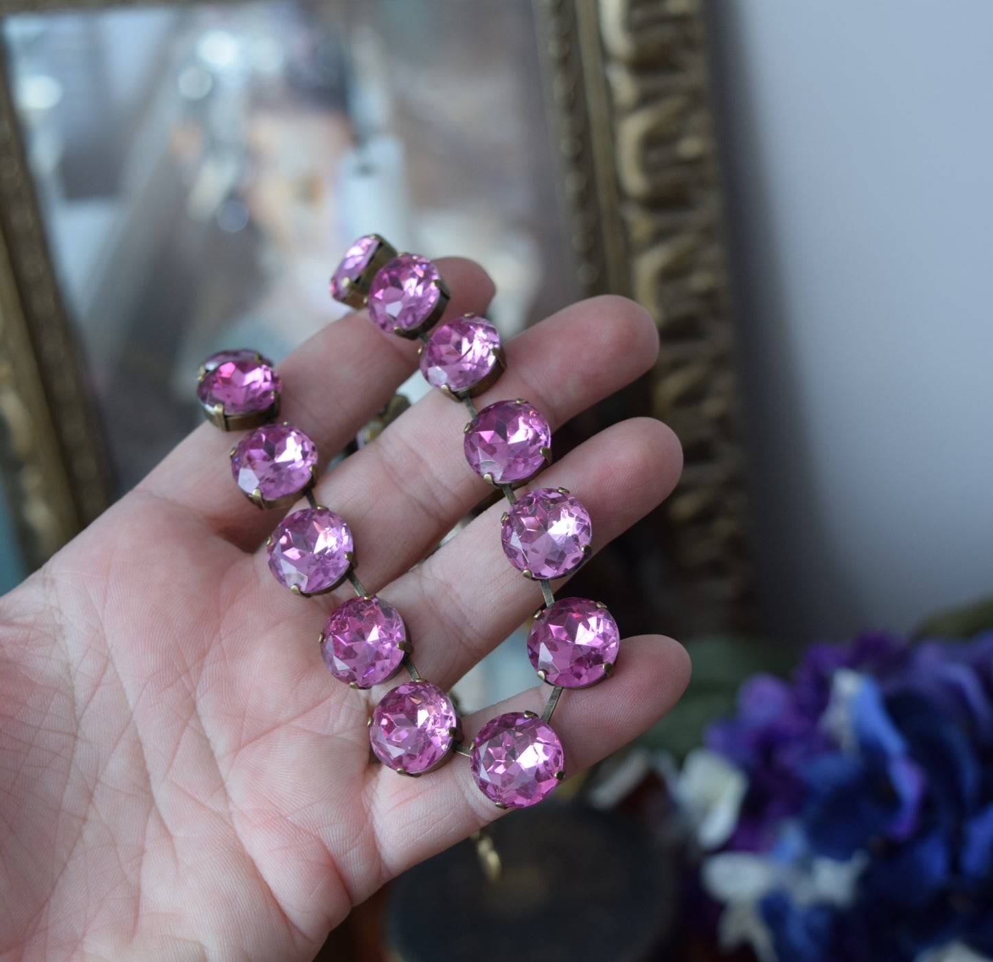 14mm vintage Czech crystals in Light Pink Topaz.  Antique Gold setting.